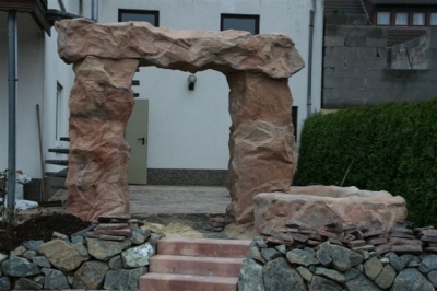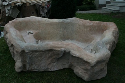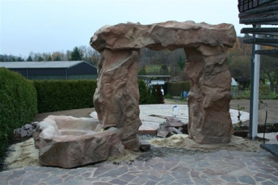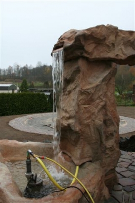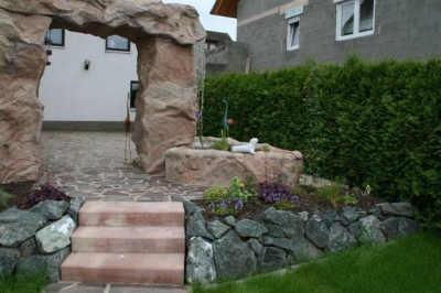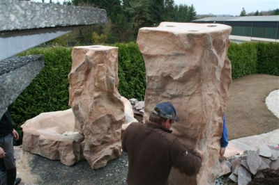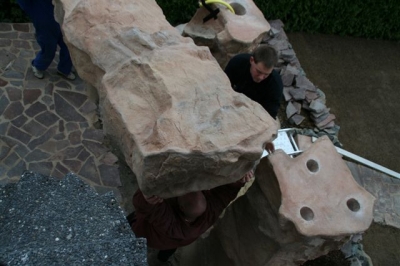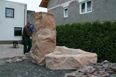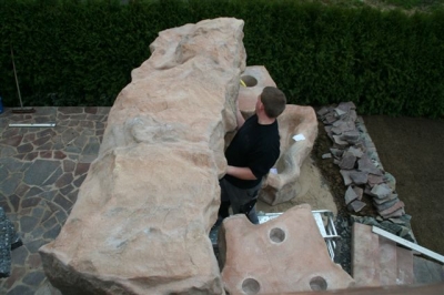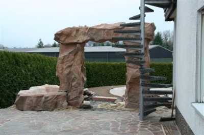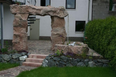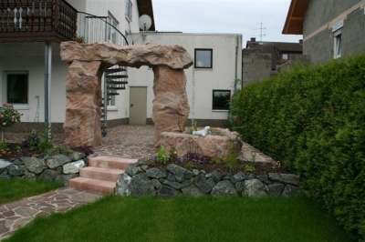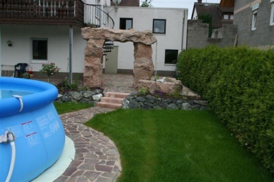 Außenanlage mit Natursteinmauer, Natursteinbelag, Treppen, Brunnen (Wasserfall), Pool und Rollrasen, fertig gestellt